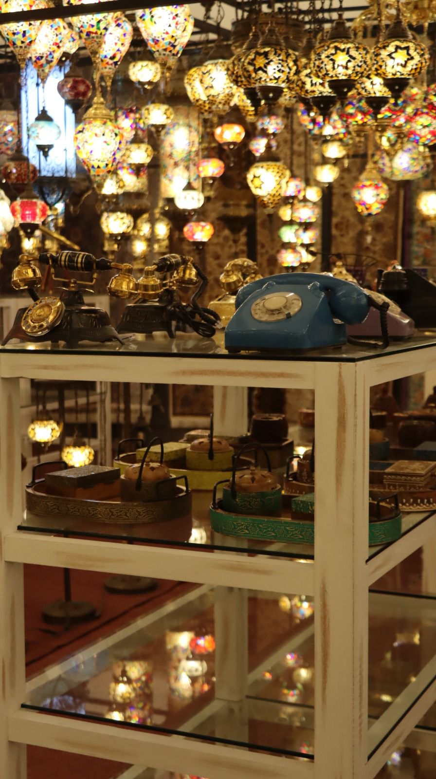 لقطة تظهر منضدة عرض بيضاء ذات أرفف زجاجية، تحمل في الأعلى مجموعة من الهواتف الدوارة القديمة بألوان مختلفة (ذهبي وأزرق)، وفي الأسفل صواني خشبية بأغطية تقليدية. الخلفية تتميز بـتوهج كثيف لأضواء الفوانيس الشرقية الملونة المعلقة.